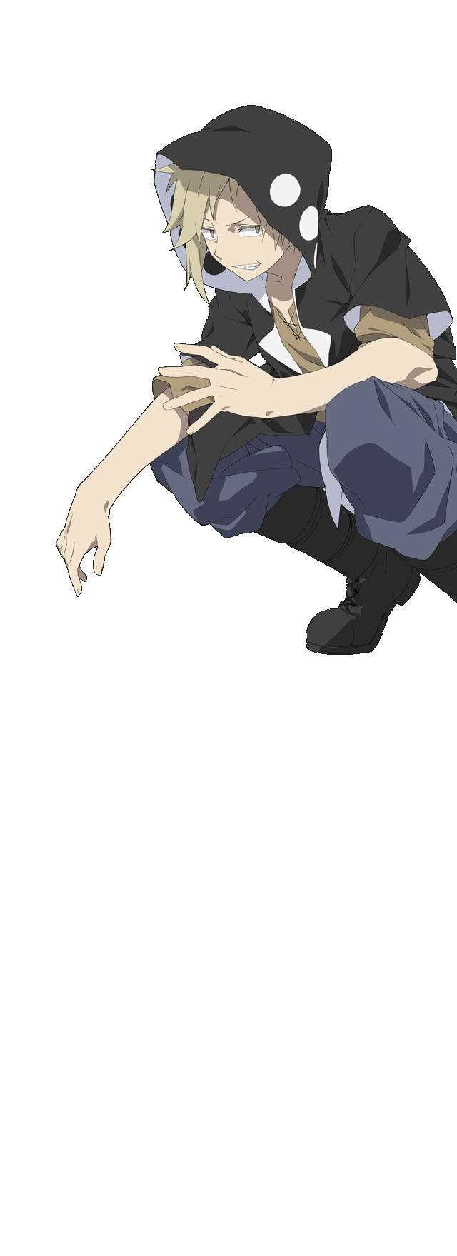 メカクシ団に所属する青年。つかみ所の無い飄々とした性格をしておりいつも笑顔を絶やさない。マリーやモモをよくからかう為、本人等からは軟派だと思われがちだがここぞという時は頼られている。 『目を欺く』能力を持っており、周りの自分に対する認識を変え、違う姿を見せることができる。